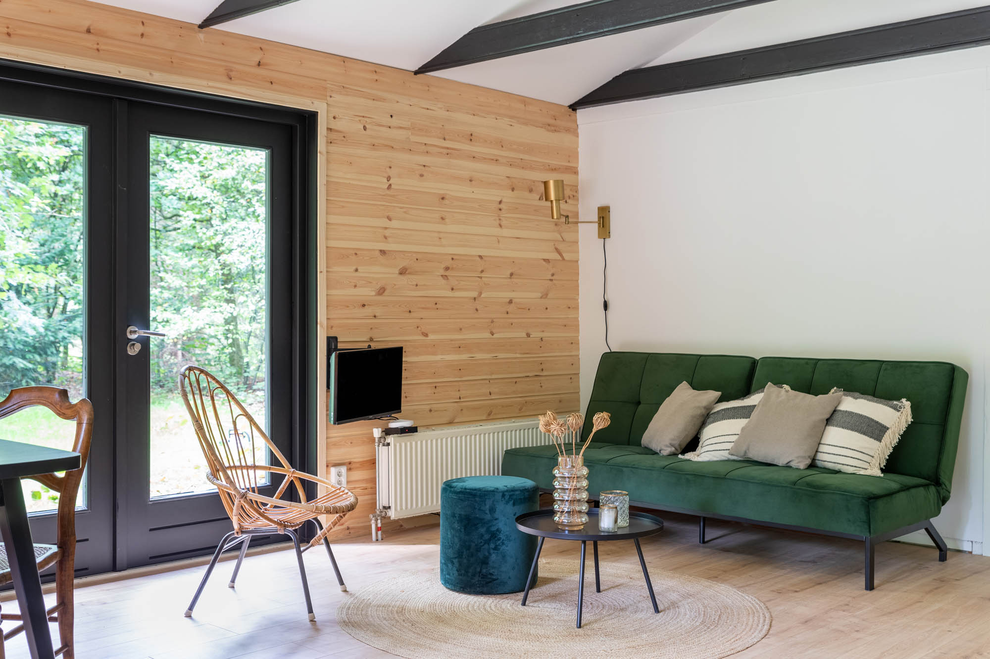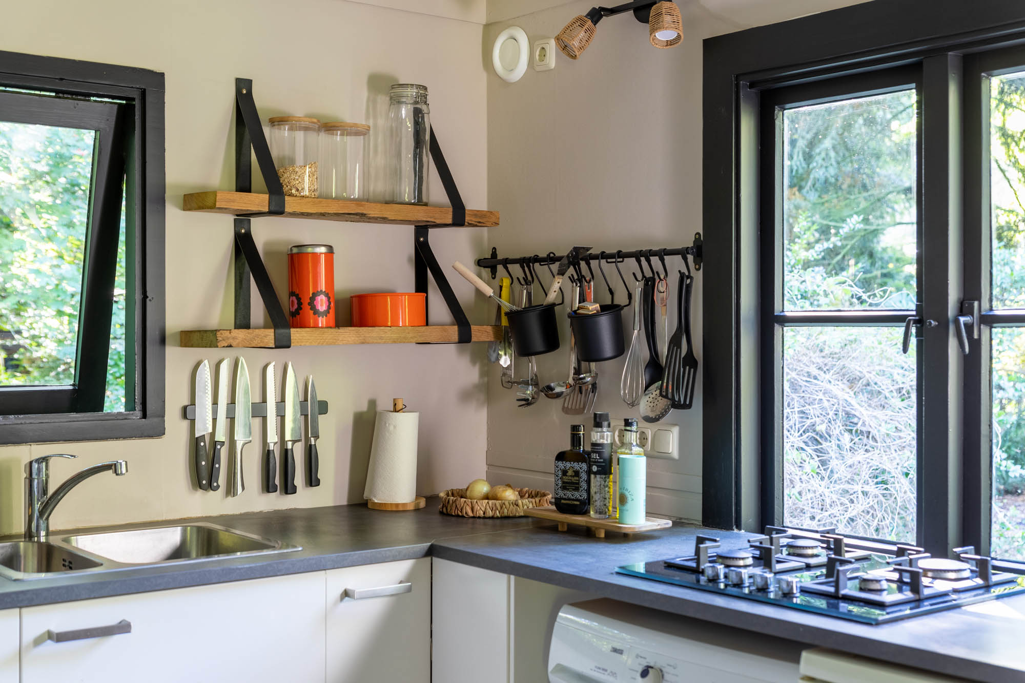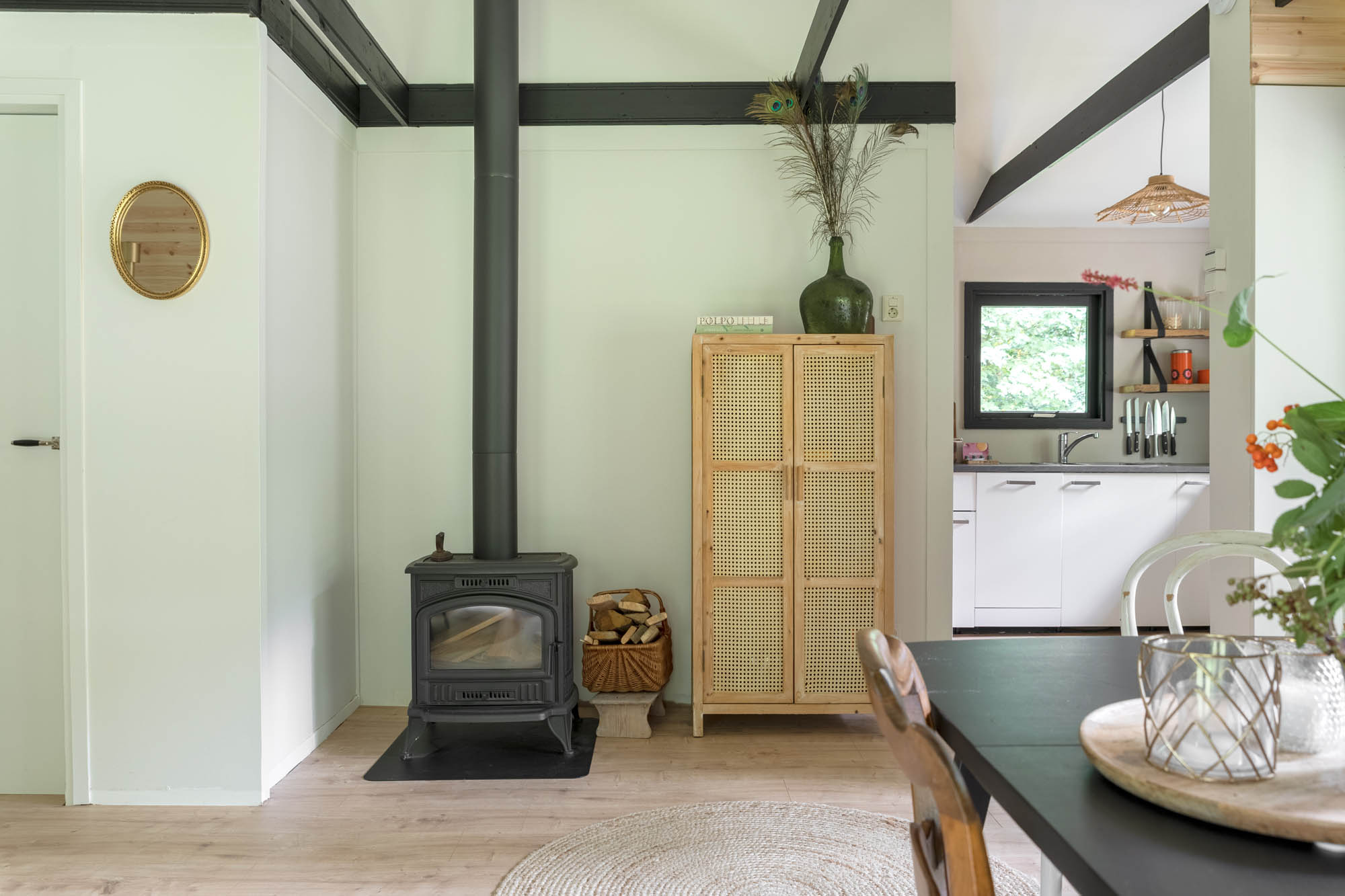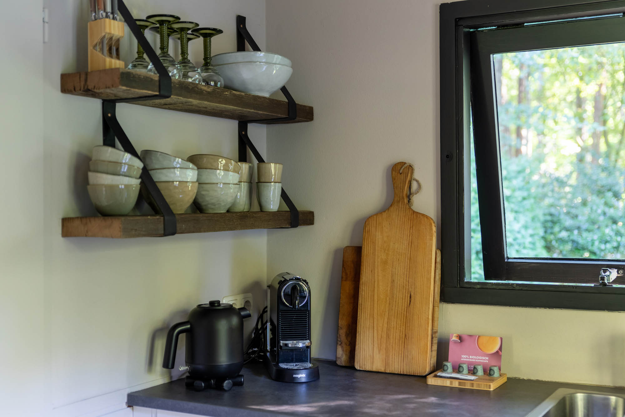 Hoewel je midden in het bos verblijft, hoef je niets in te leveren op comfort. Het huisje is sfeervol ingericht en biedt alles wat je nodig hebt voor een ontspannen verblijf. De bedden zijn zacht en uitnodigend, de keuken is goed uitgerust – inclusief een vaatwasser en een Nespresso-apparaat – en de badkamer is sfeervol en voorzien van een inloopdouche met rainshower.